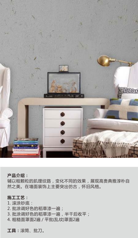 稻草漆稻草漆又名生態(tài)稻草漆,是最原始、最樸素、最溫馨宜人的建筑材料。引進(jìn)日本技術(shù)加工工藝,利用稻桿、微空粉末、石英粉等天然材料制成生態(tài)稻草漆,讓您時(shí)刻擁有自然的鄉(xiāng)土氣息,轉(zhuǎn)身于寧?kù)o、古樸的環(huán)境中。稻草漆生產(chǎn)材料選用的都是稻桿、 蛭石粉、微空粉末、 石英粉等天然材料,不用擔(dān)心會(huì)產(chǎn)生 甲醛、VOC排放等問(wèn)題。